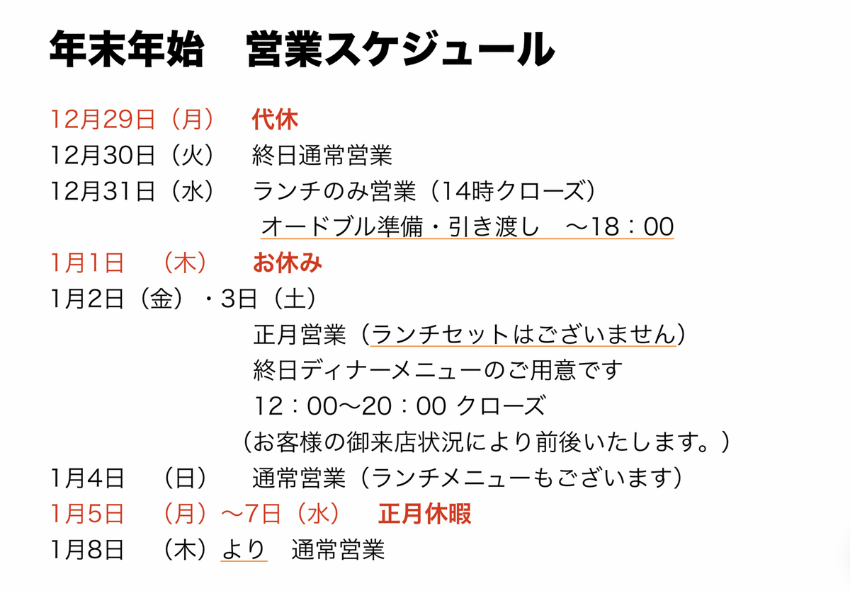年末年始の営業スケジュールです。